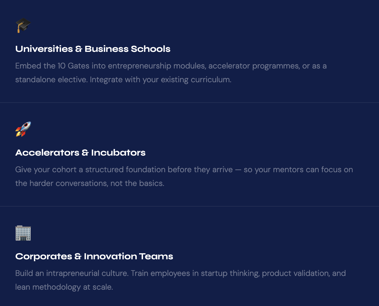 We offer customised group access for universities, accelerators, incubators, and organisations looking to train cohorts of early-stage founders.